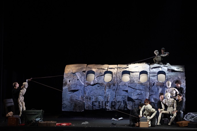 impatto visivo: marionette ibride ispirate alle figure filiformi di Giacometti. Questi puppets, evocativi e